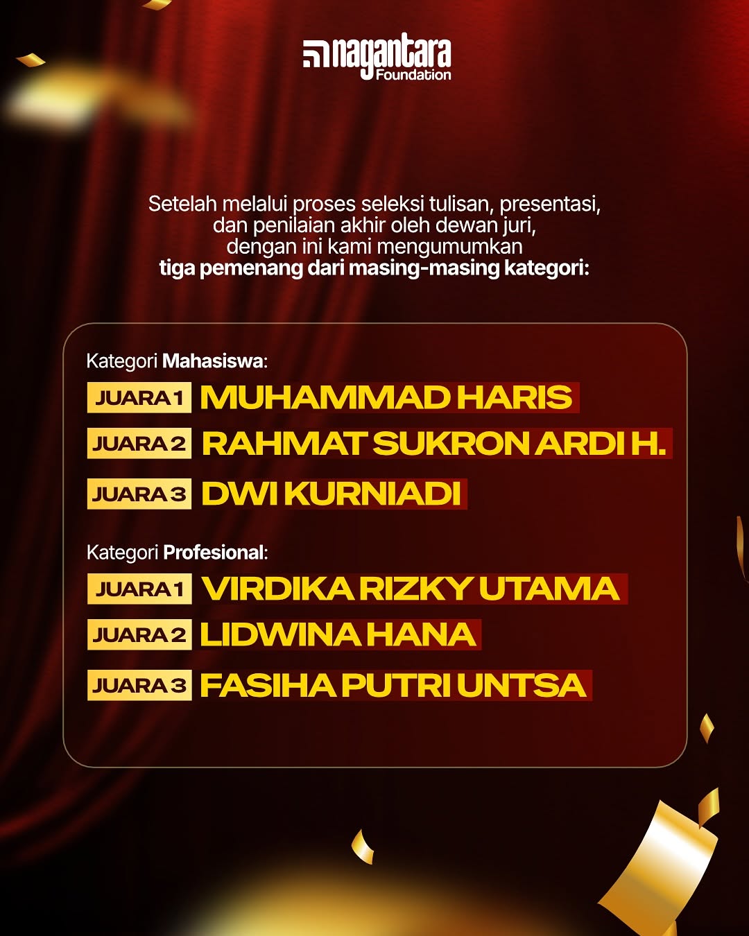 Program Studi S2 Administrasi Publik mengucapkan selamat dan apresiasi setinggi-tingginya kepada Rahmat Sukron Ardi Hidayat yang berhasil meraih Juara 2 dalam Lomba Esai Nasional yang diselenggarakan oleh Nagantara Foundation (NGO Indonesia–Tion