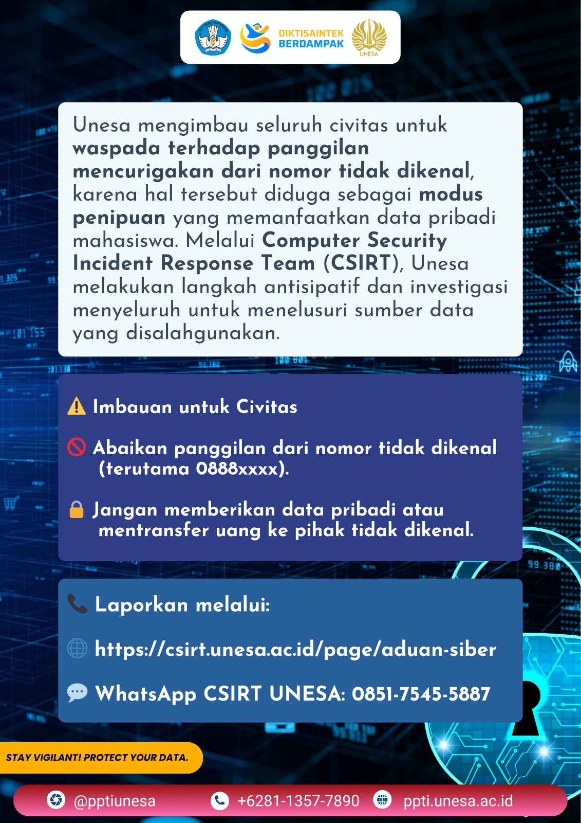 Unesa memberikan imbauan kepada seluruh civitas untuk selalu waspada terhadap panggilan mencurigakan dari nomor tidak dikenal.